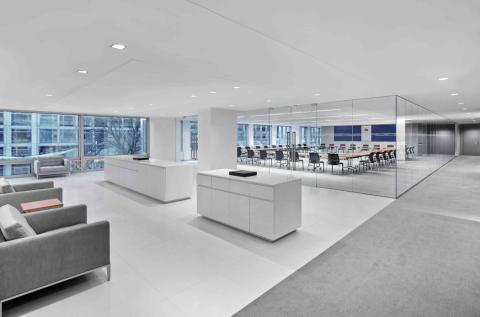 Arent Fox Tenant Fit-Out includes the fit-out of eight floors. The office is a custom design for Arent Fox that includes a combination of work stations and offices, conference rooms, and galleys. Additional unique and high-end elements include a water feature, 150-seat auditorium, a cafe, and egg-shaped penny-tile-clad pantries.