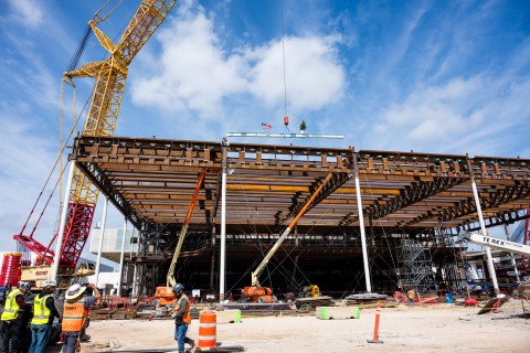 The topping out ceremony marks the point at which the structure reaches its full height. To achieve this milestone, crews have worked more than 290,000 hours, installed 2,200 tons of steel, and completed a tandem crane pick to set the 180-ton truss in place, which created the support structure and open space for the security screening checkpoint.