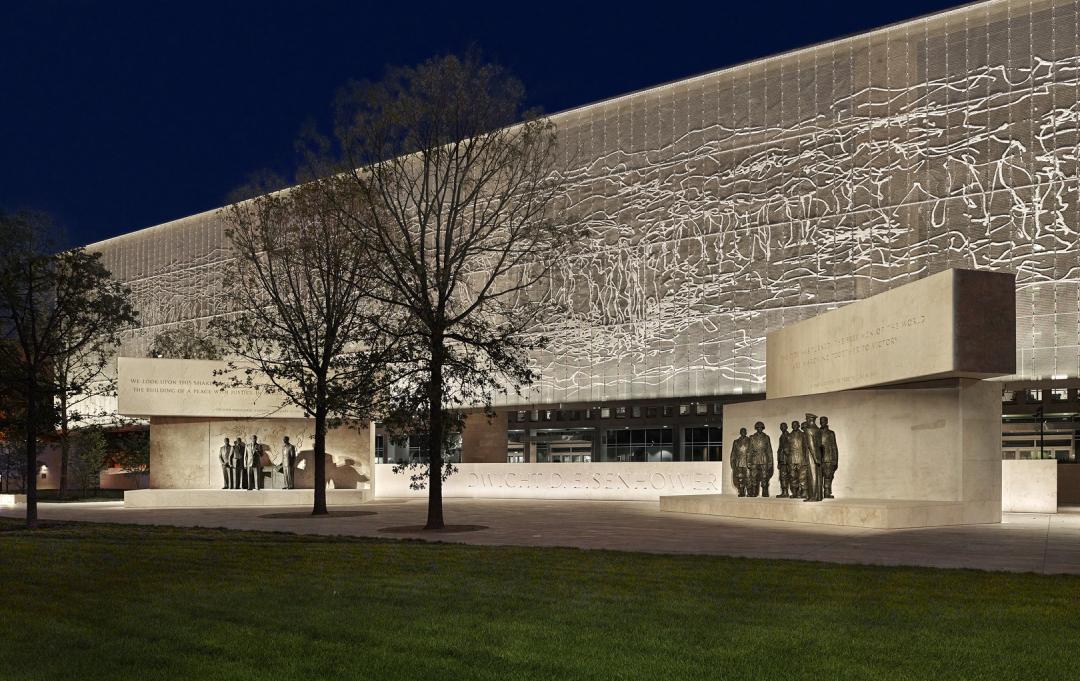The 450-foot-long stainless steel tapestry at the Dwight D. Eisenhower Memorial is comprised of 604 separate artwork panels and was fabricated in five 87-foot-long sections that weigh 56,000 pounds each.