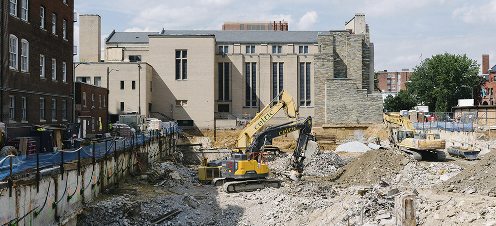 Above-grade demolition cleared the way for excavation to begin, making way for an additional below-grade story for the new structure. During this process, Clark Foundations installed tie-back rods to reinforce existing foundation walls, allowing portions of the existing walls to serve as temporary support during excavation.